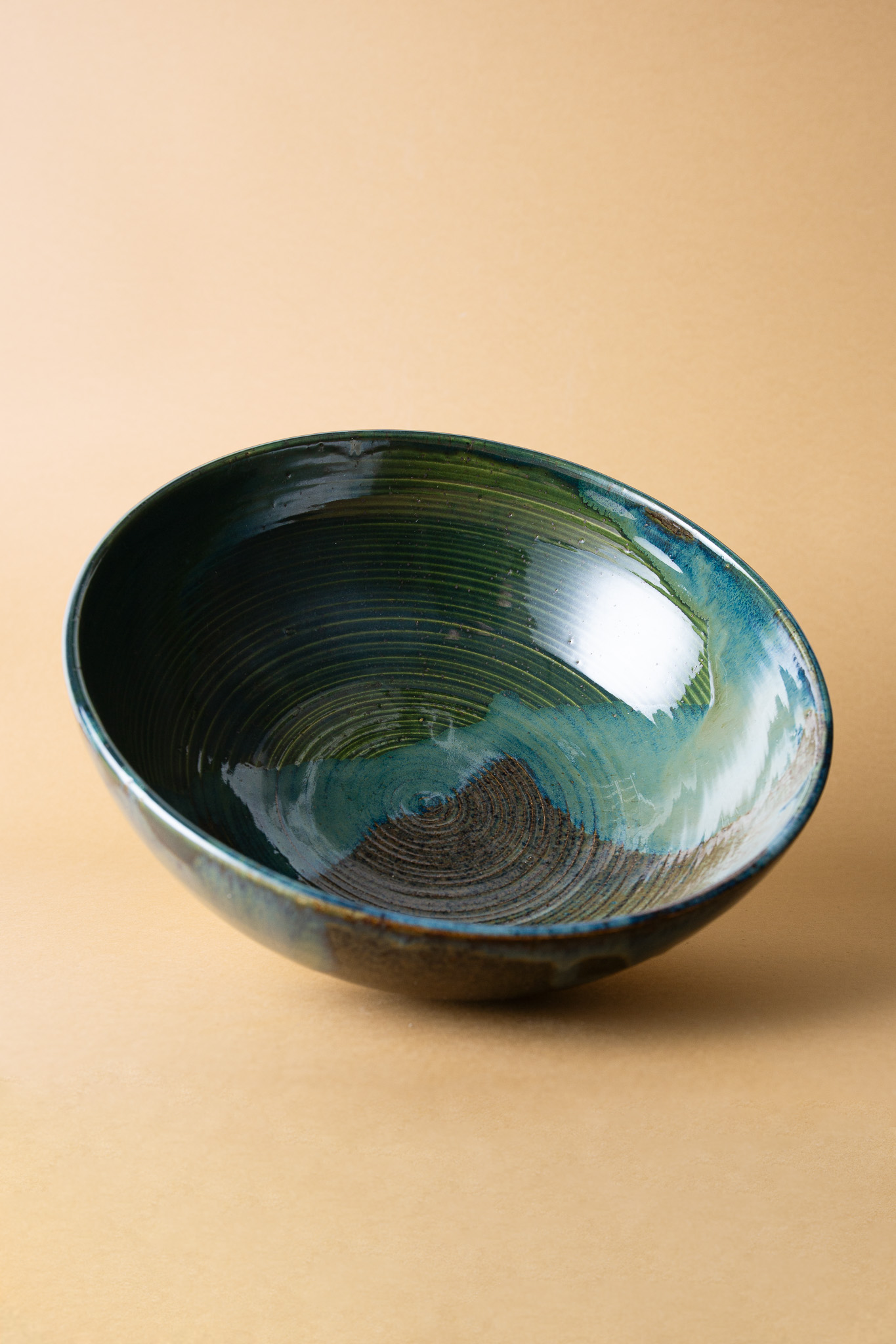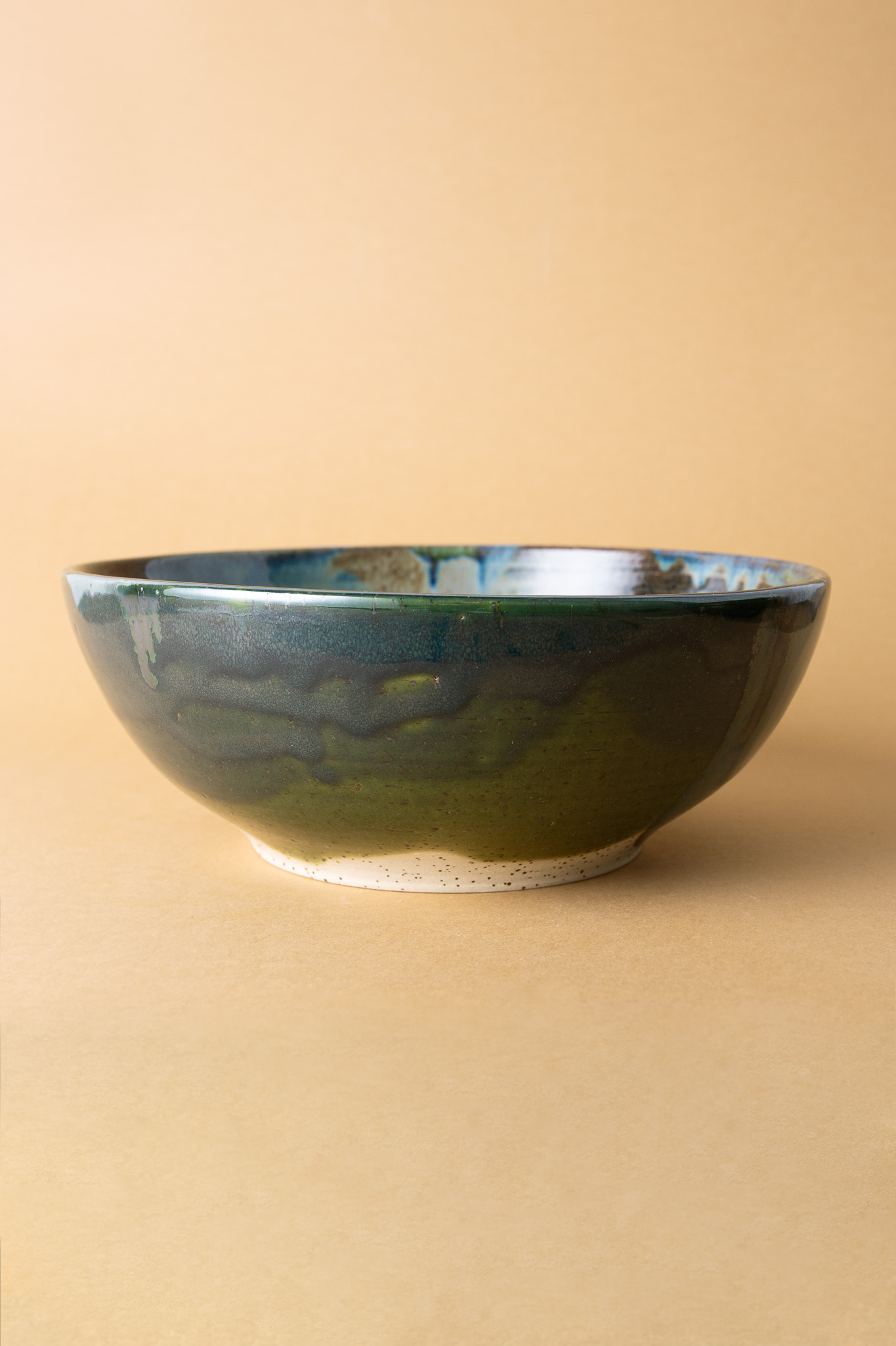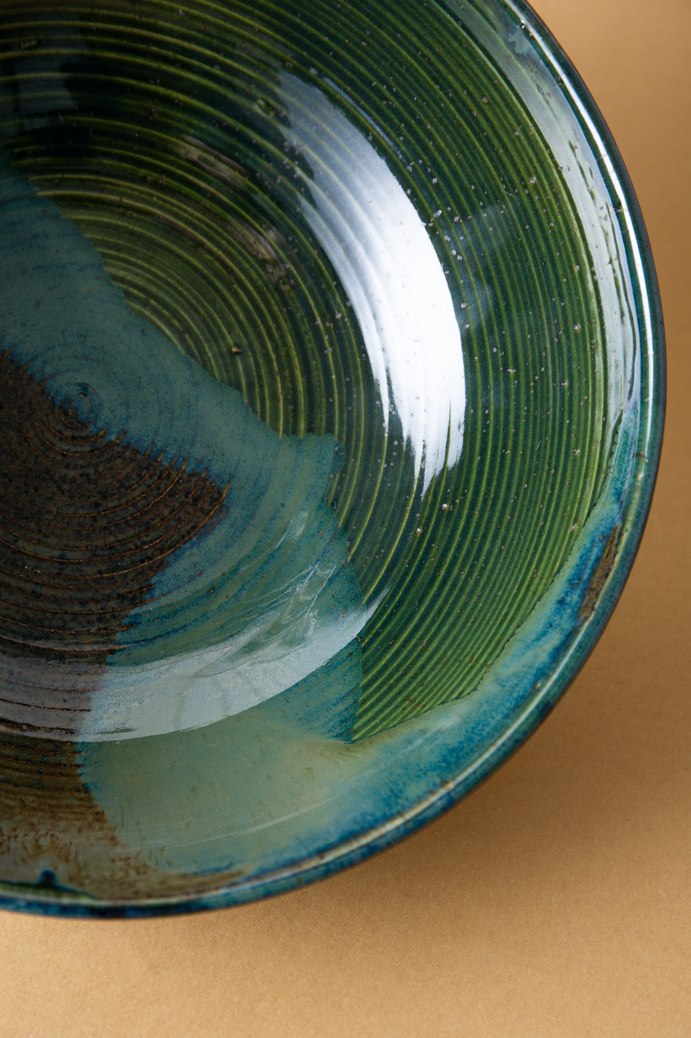 Wnętrze misy pokrywa autorska mieszanka szkliw w odcieniach zieleni, brązu i chłodnego błękitu, które układają się w organiczny, niemal pejzażowy rysunek. Każde spojrzenie odkrywa w niej coś innego.